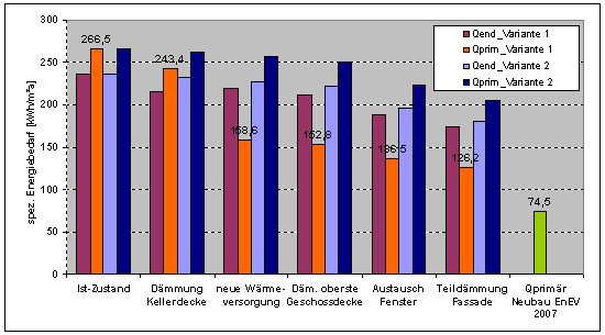 Um den wärme- und anlagentechnischen Standard des Gebäudes zu verbessern, werden zwei Sanierungsvarianten vorgeschlagen. Variante 1 verfügt über ein sehr hohes Einsparpotential bezüglich Primärenergie und Kohlendioxidemissionen, in Variante 2 sind die weniger aufwändigen Sanierungsoptionen mit insgesamt geringerem Einsparpotential zusammengefasst.